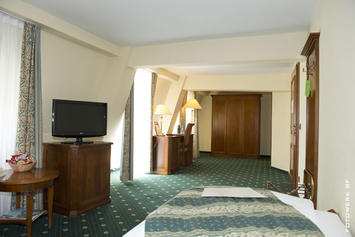 Das Zimmer ist 40 qm groß und verfügt über Bad/Dusche und WC. Im Bad befindet sich auch ein Schminkspiegel und ein Föhn. Im Wohnbereich stehen Schreibtisch, Minikühlschrank, Farb-TV, Radio, drahtloser Internetzugang über T-Mobile Hotspot und ein Safe dem Gast zur Verfügung. Buchbar ist ein Zimmer mit Blick zum Vorschloss.