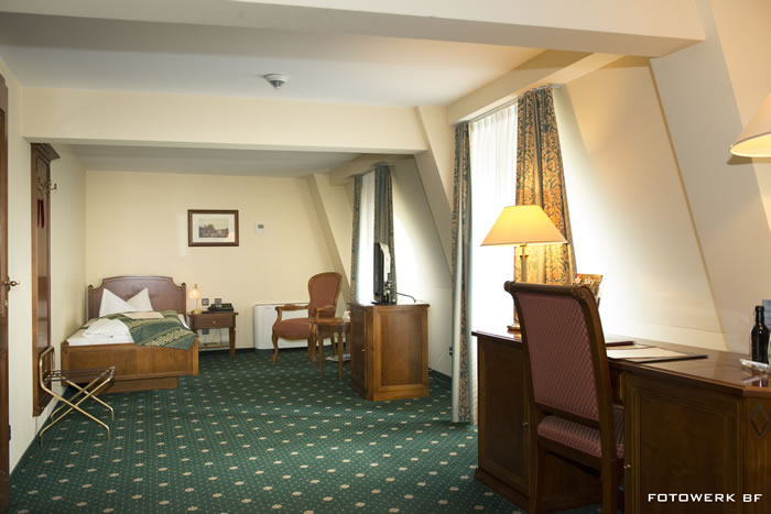 Die Zimmer sind 22 qm groß und verfügen über Bad/Dusche und WC. Im Bad befinden sich ein Schminkspiegel und ein Föhn. Im Wohnbereich stehen Schreibtisch, Minikühlschrank, Farb-TV, Radio, drahtloser Internetzugang über T-Mobile-Hotspot und ein Safe dem Gast zur Verfügung. Buchbar sind Zimmer mit Blick zum Schlosshof und zum Vorschloss.